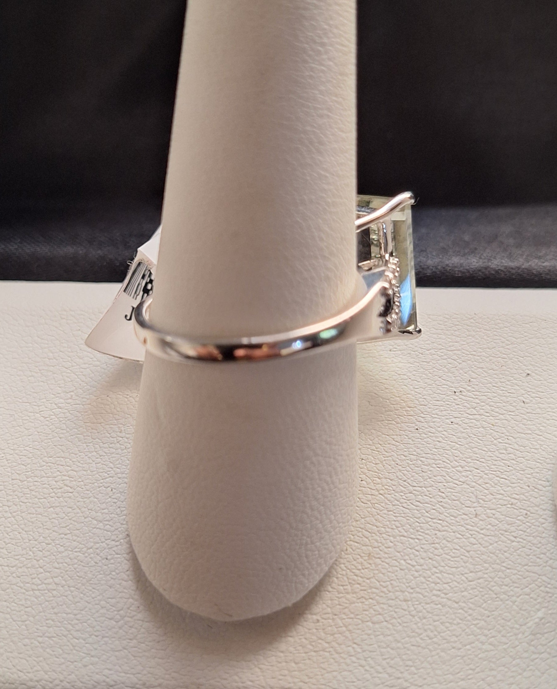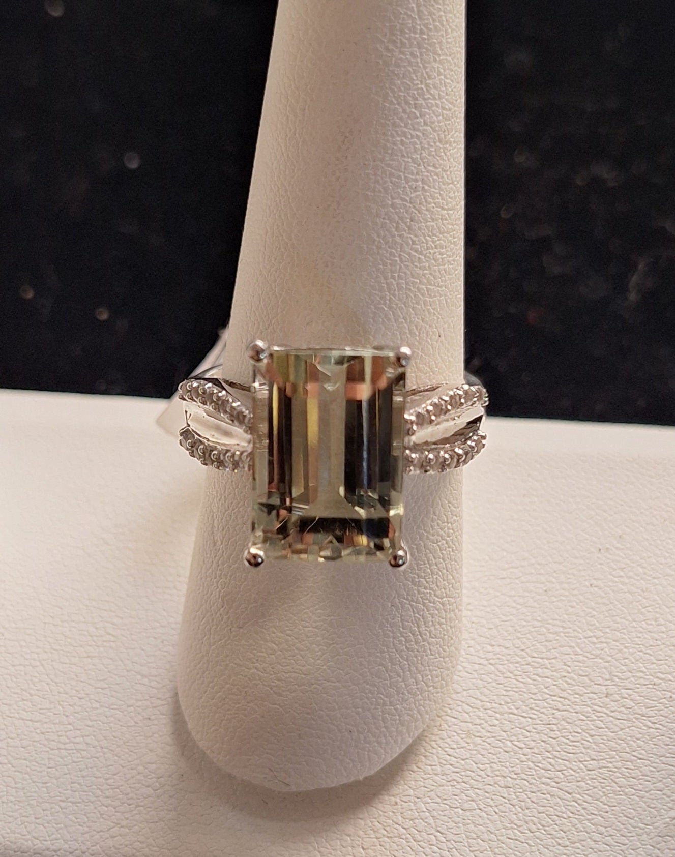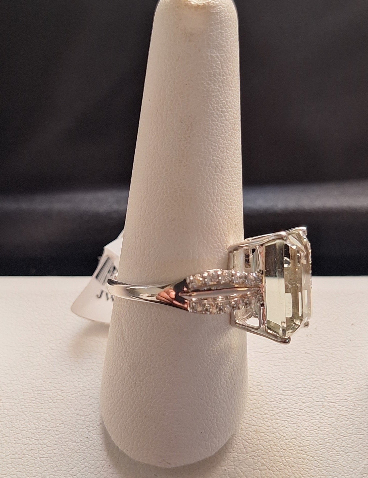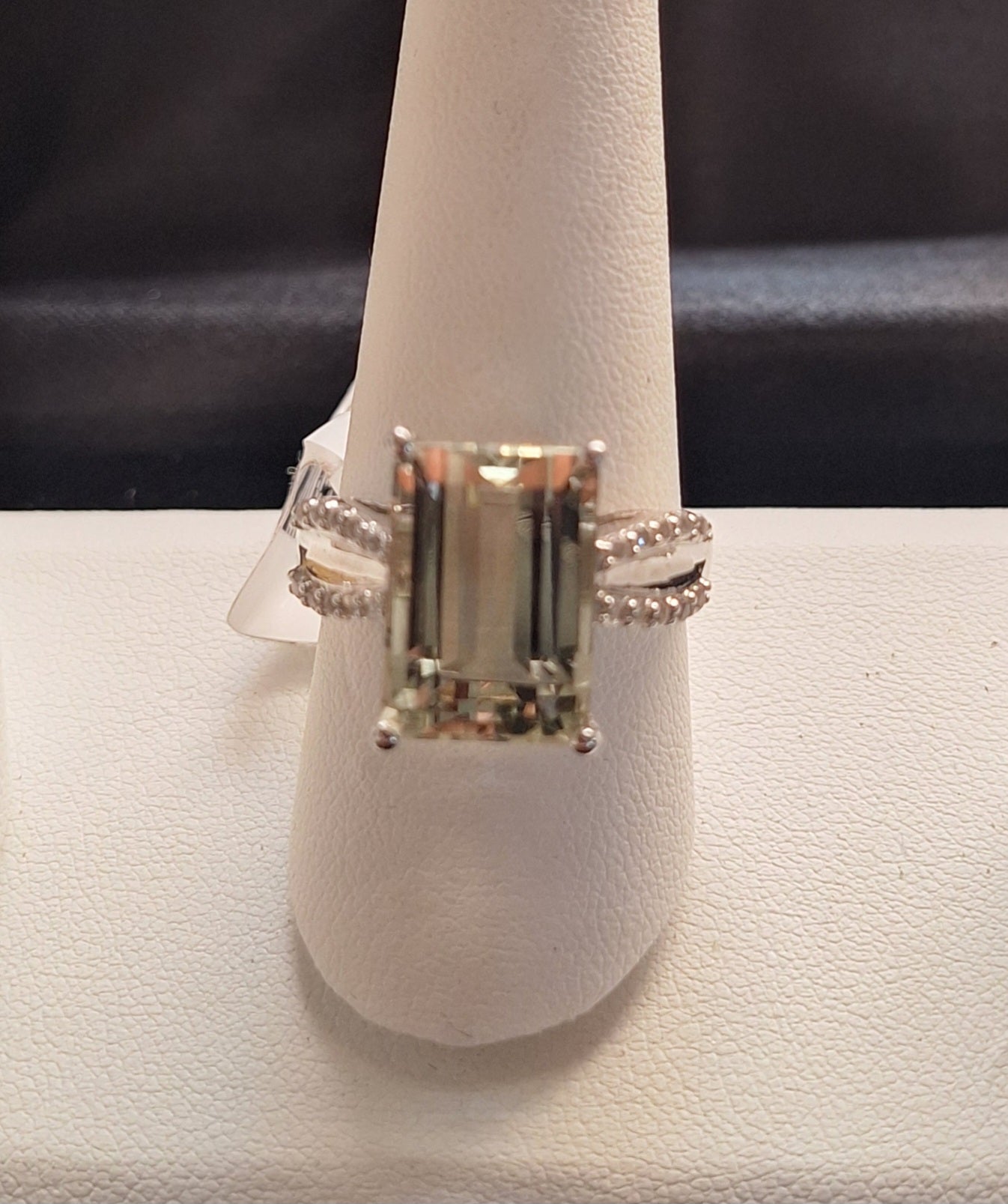 A Natural Green Amethyst Ring set in 925 Sterling Silver, featuring an emerald cut stone. This Prasiolite is imported from Brazil.