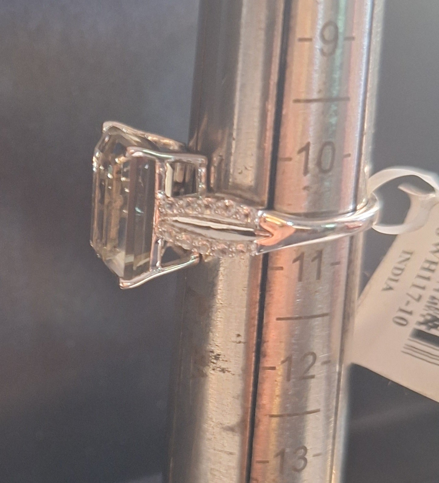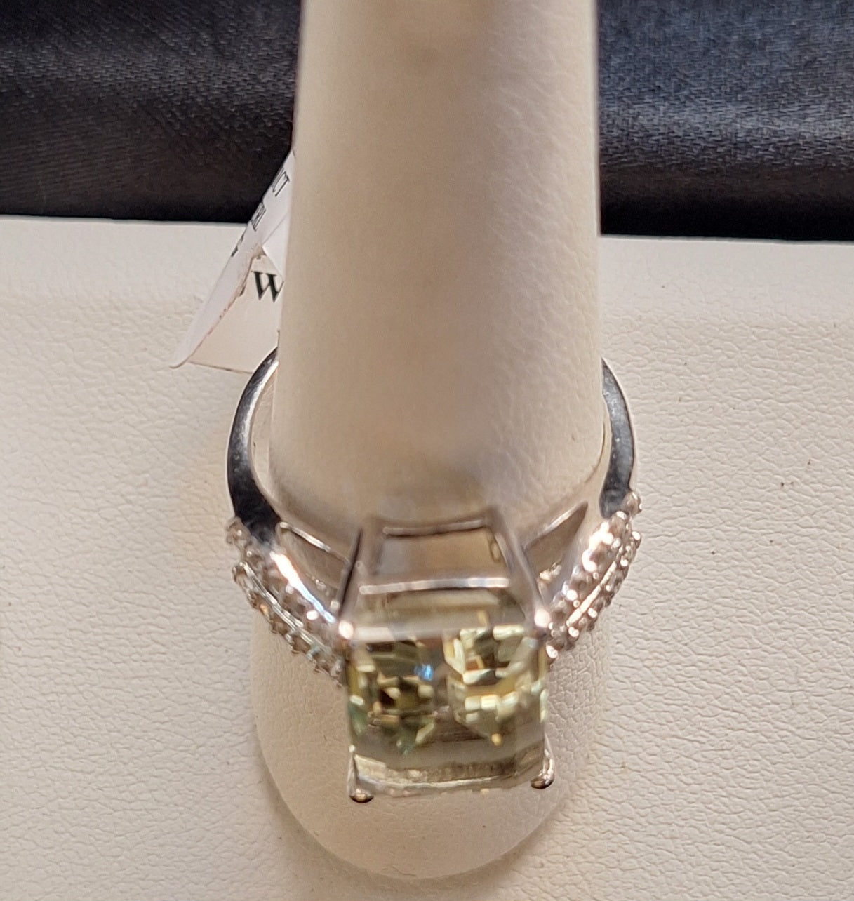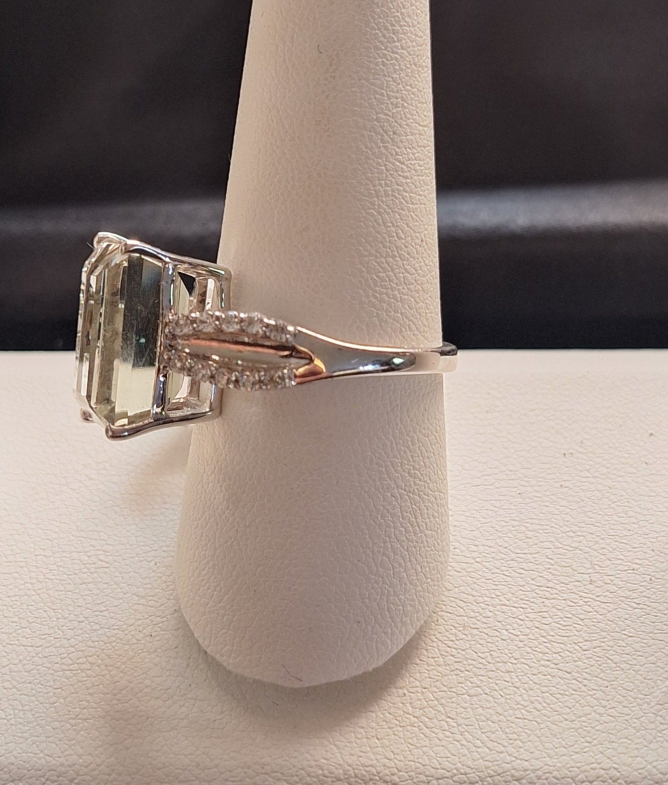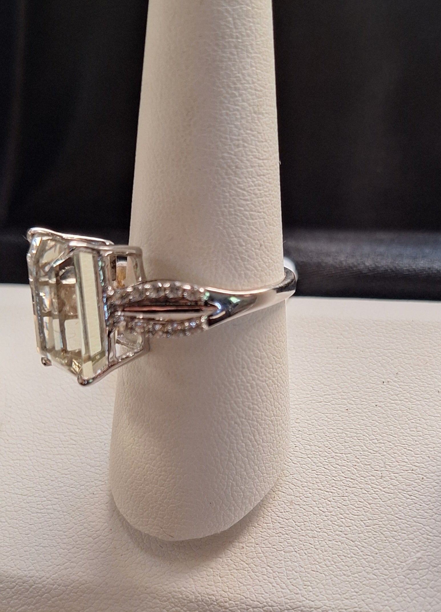A Natural Green Amethyst Ring set in 925 Sterling Silver, featuring an emerald cut stone. This Prasiolite is imported from Brazil.