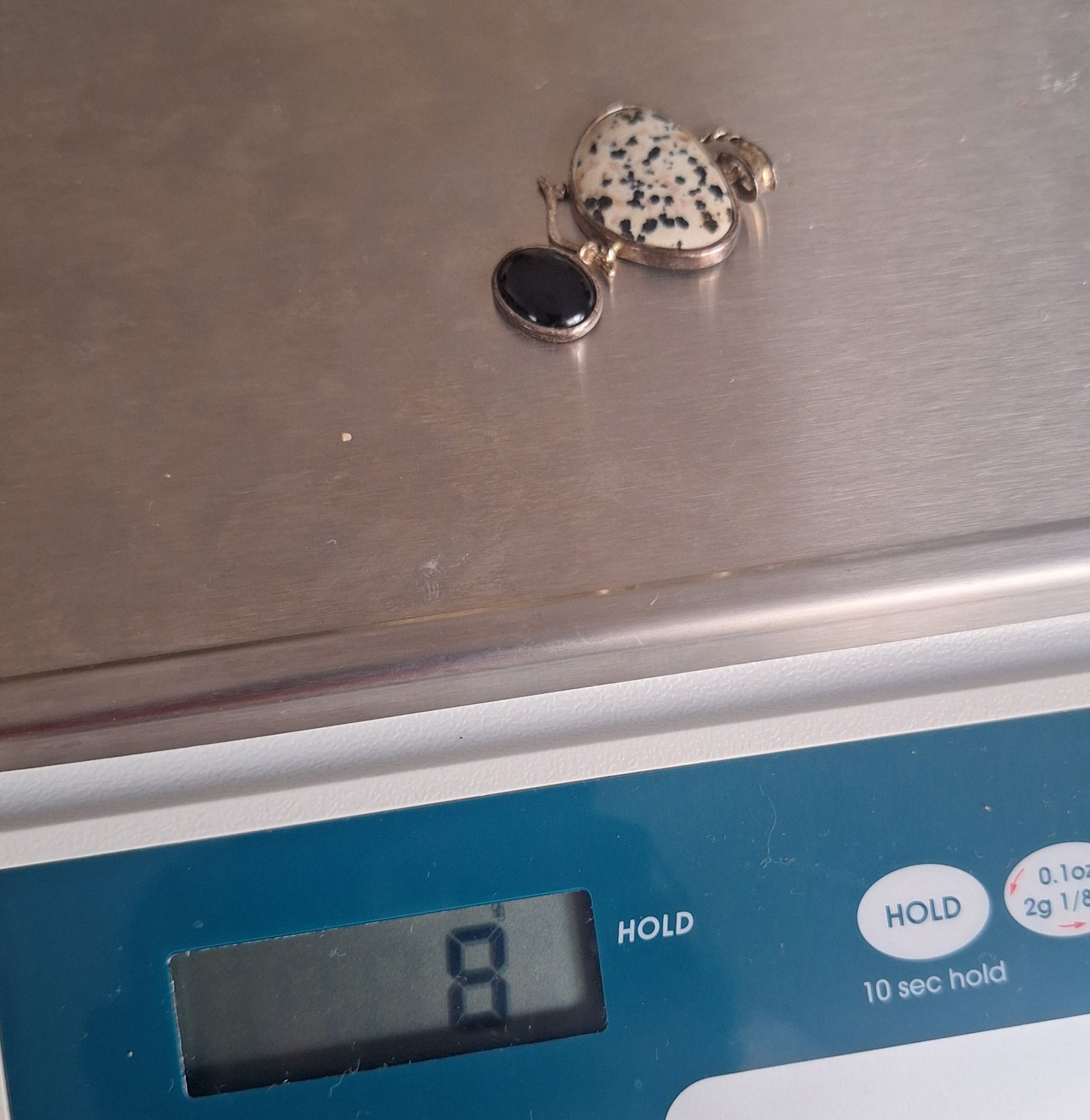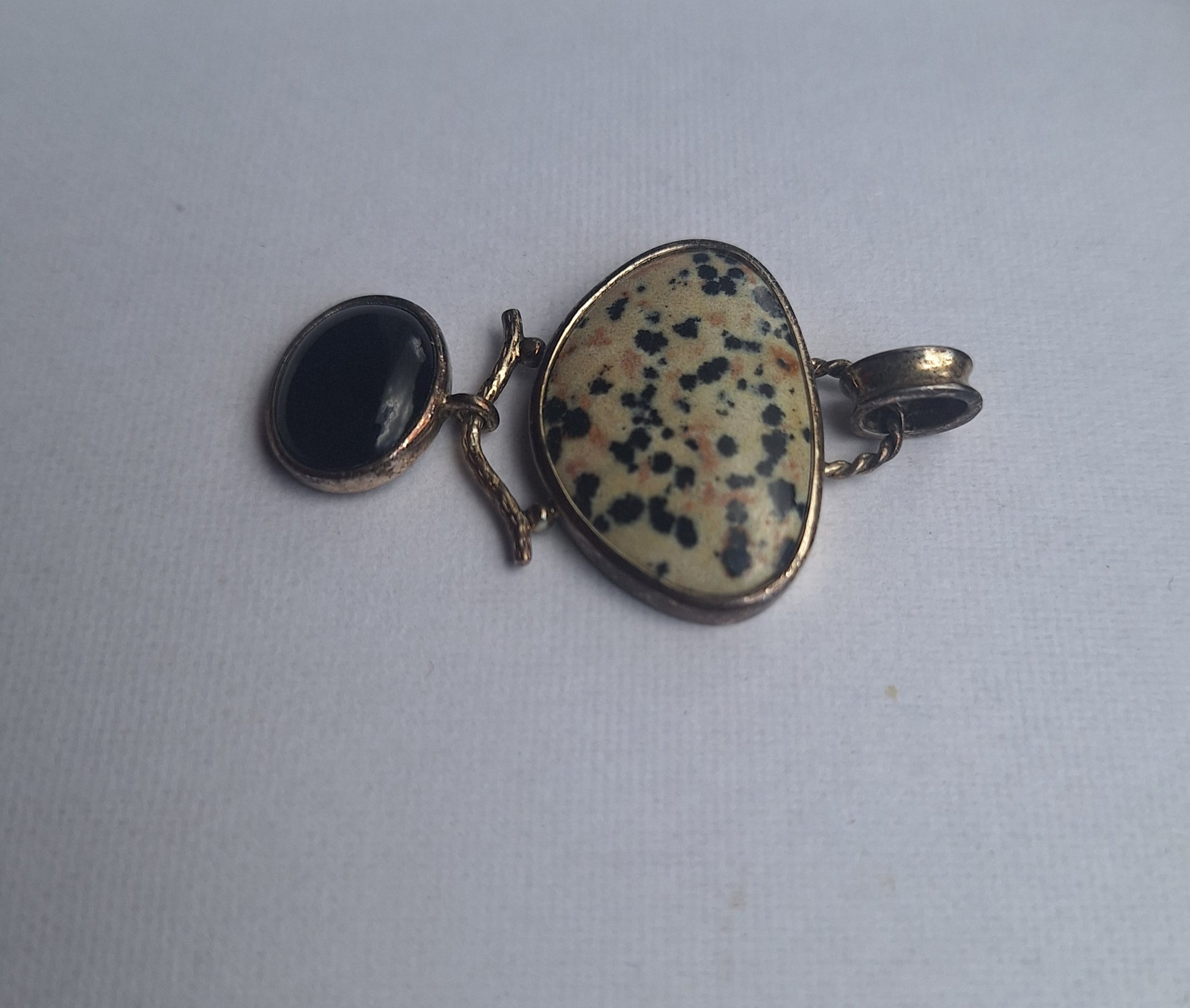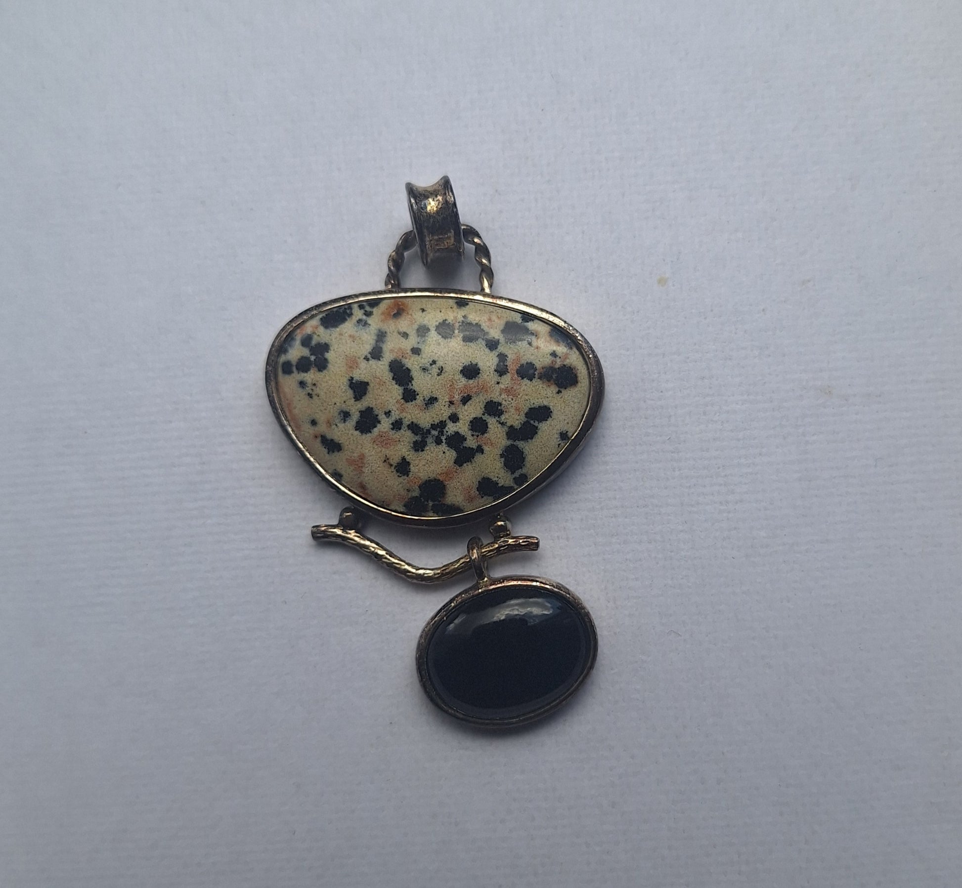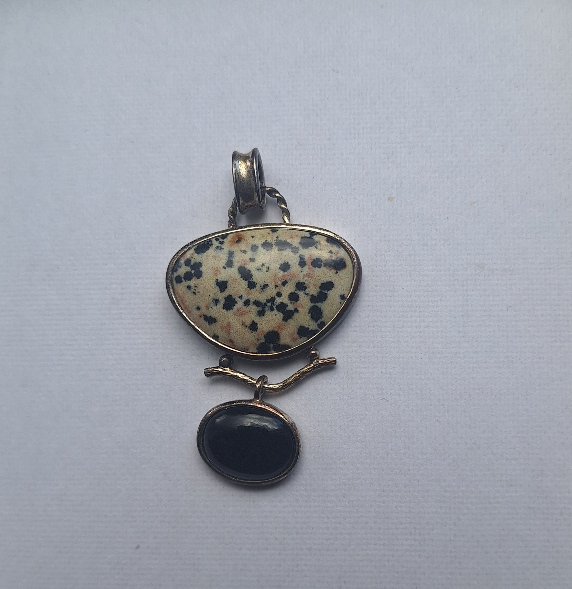 This pendant features an oval-shaped Dalmatian jasper stone mounted horizontally, with a smaller black onyx cabochon suspended beneath it.
