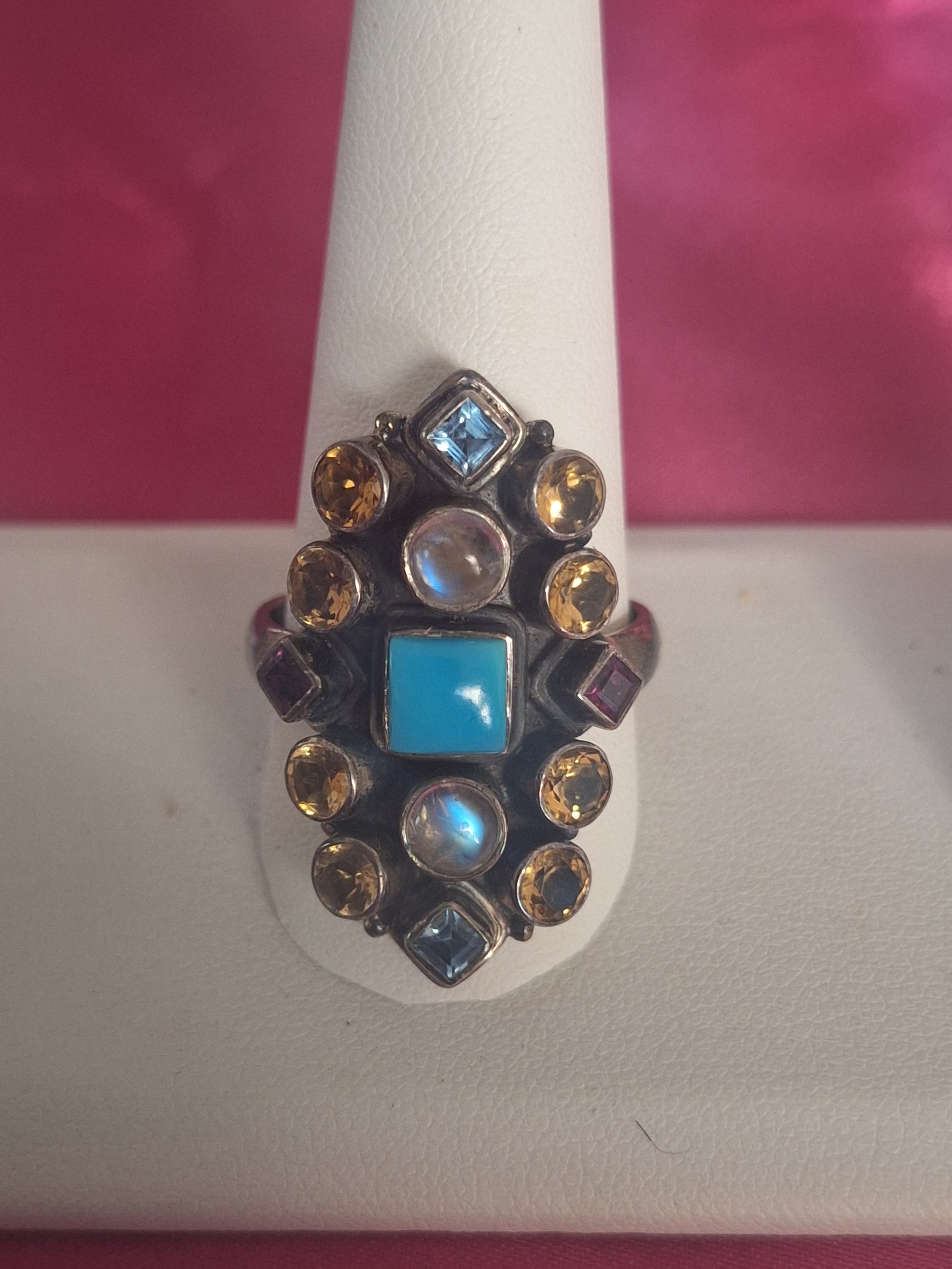 Nicky Butler 925 Sterling Citrine, Garnet, Topaz, Moonstone & Turquoise Ring. Size 12.5