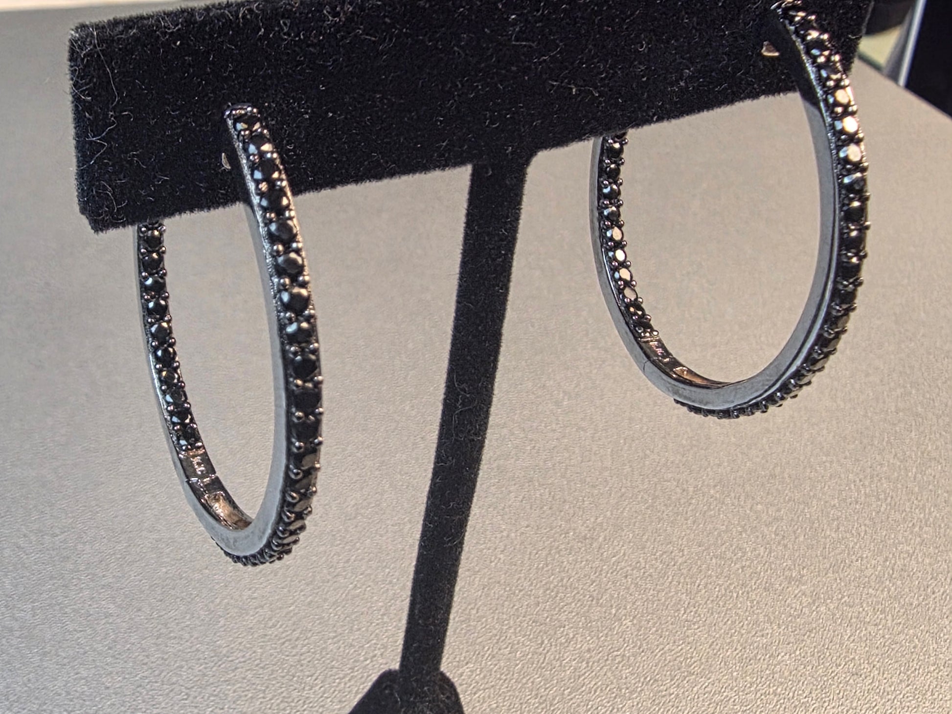 Introducing our stunning Black Diamond Hoop Earrings, expertly crafted in luxurious sterling silver. These large, hinged hoop earrings showcase a wide design that effortlessly combines elegance and modern style. Perfect for any occasion, whether you're dressing up for a night out or adding a touch of sophistication to your everyday look, these earrings are sure to turn heads. Their exquisite black diamond accents provide a striking contrast against the gleaming silver, creating a captivating sparkle that will enhance your natural beauty. Elevate your jewelry collection with these must-have hoop earrings, designed to make a statement and reflect your unique style. Don't miss out on this fantastic addition to your accessory wardrobe!