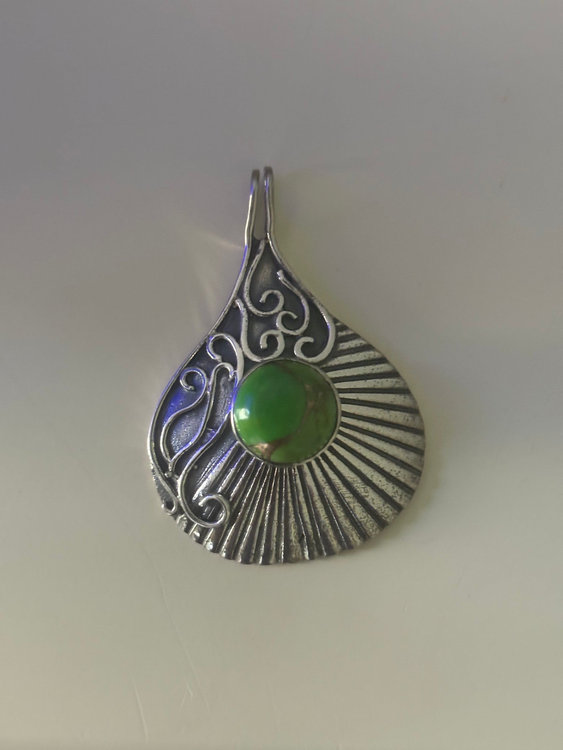 Imagine adorning yourself with this enchanting pendant, featuring a perfectly smooth, round cabochon of rich green turquoise. The vibrant hues of the stone evoke a sense of tranquility and balance, reminiscent of calm ocean waves and serene landscapes. Each piece is unique, showcasing the enchanting patterns found in the turquoise that nature has carefully created over centuries.