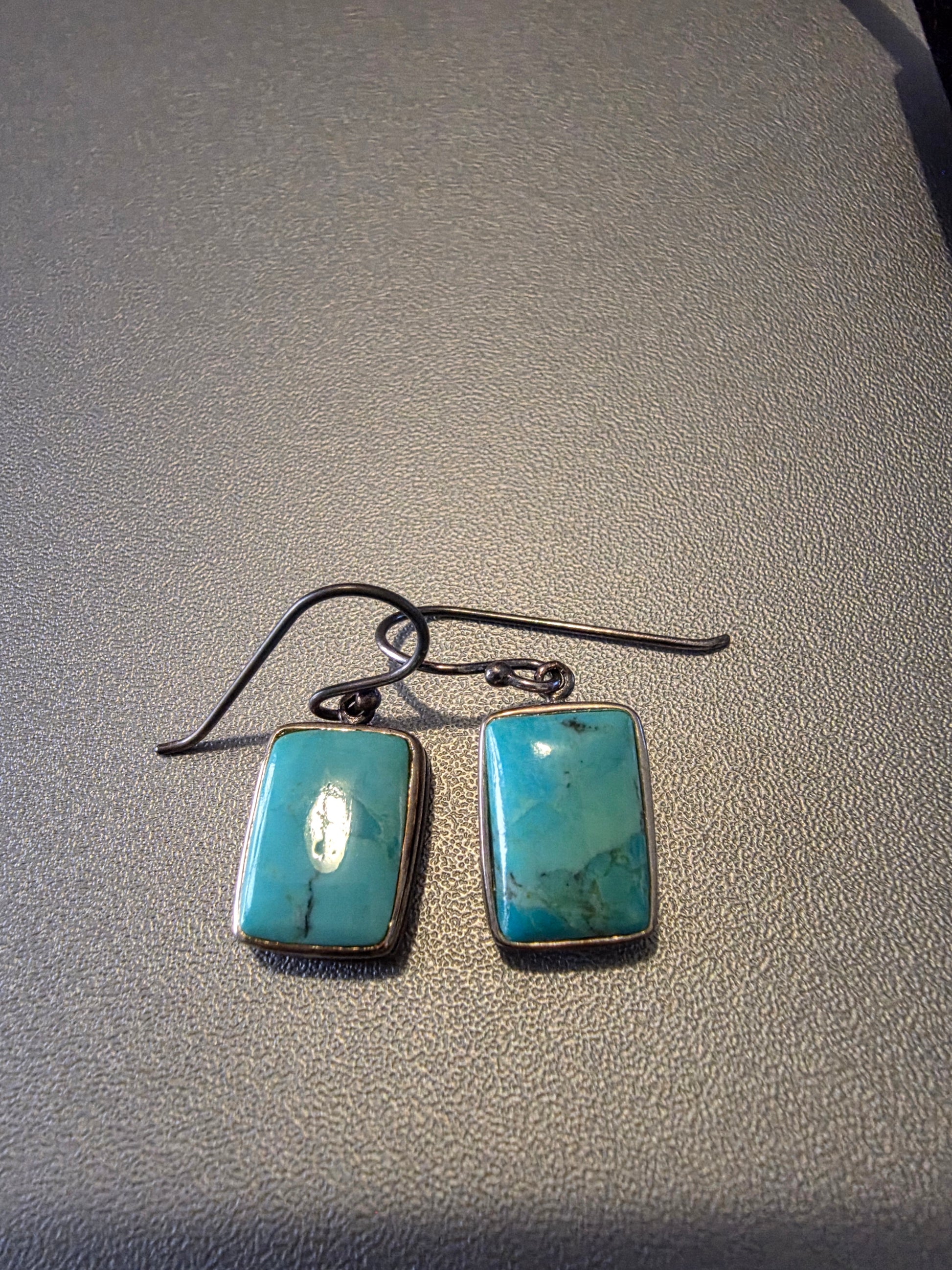 Each cabochon has been carefully shaped into a lovely rectangular form, showcasing the natural beauty of the turquoise while exuding a sense of timeless sophistication. The lightweight dangle design ensures comfort, making these earrings perfect for any occasion, whether you're dressing up for a special event or simply adding a touch of flair to your everyday outfit.