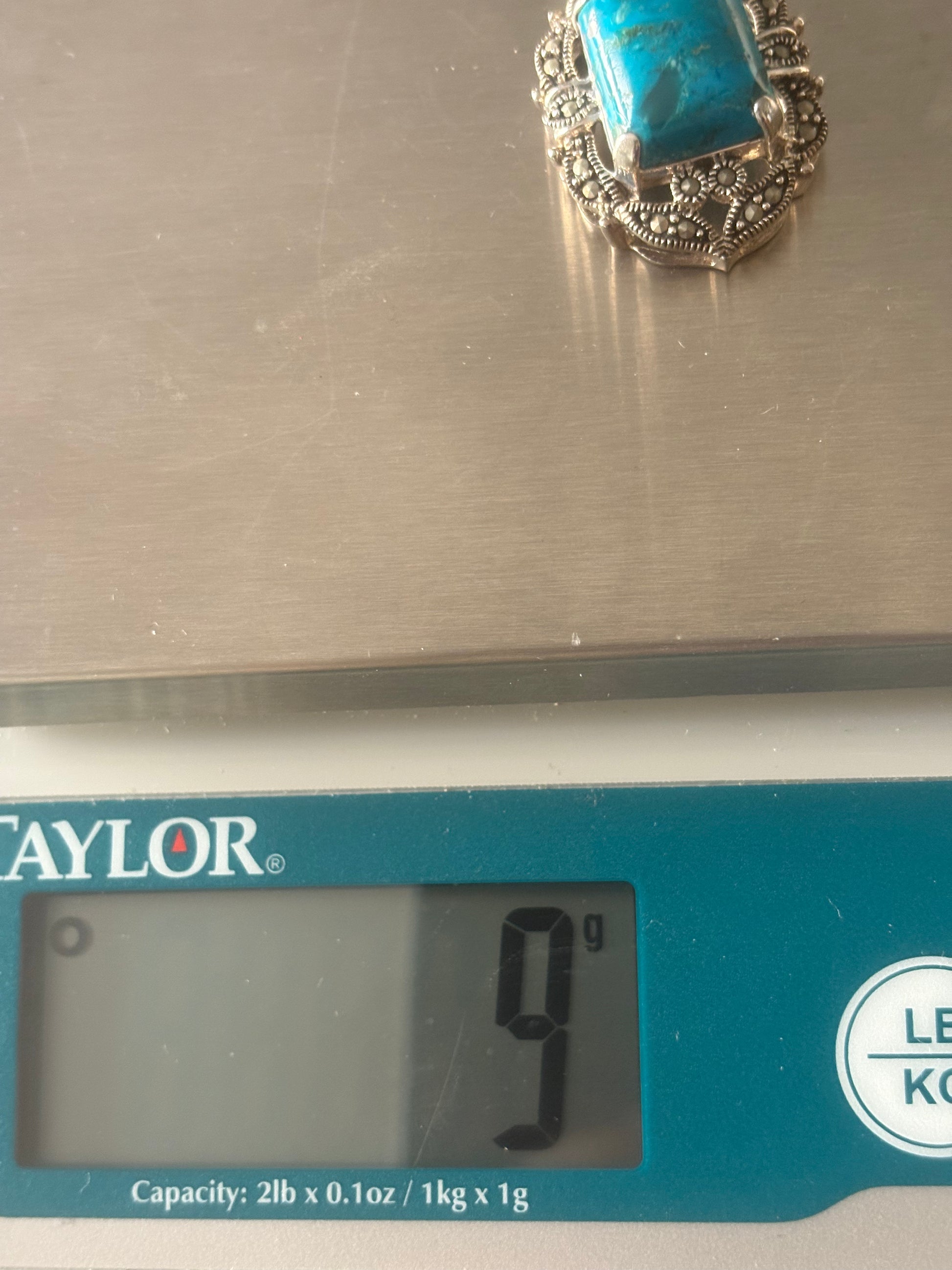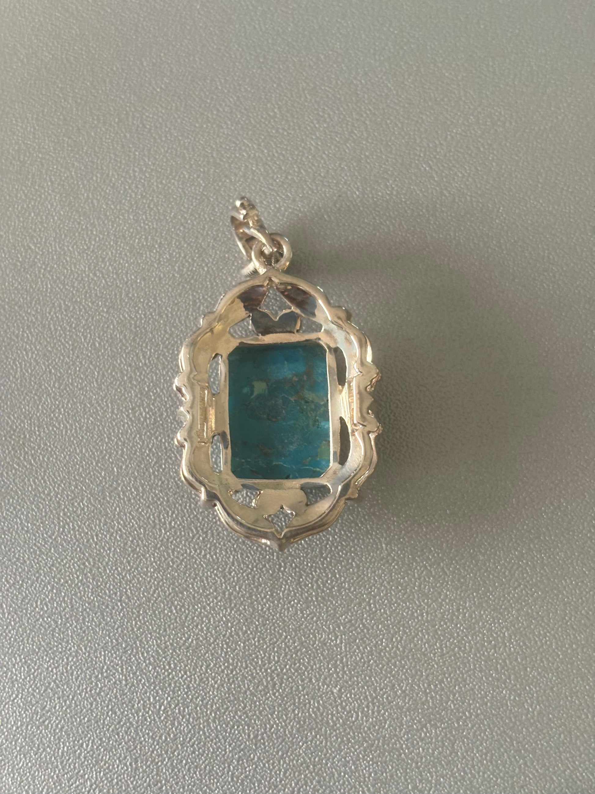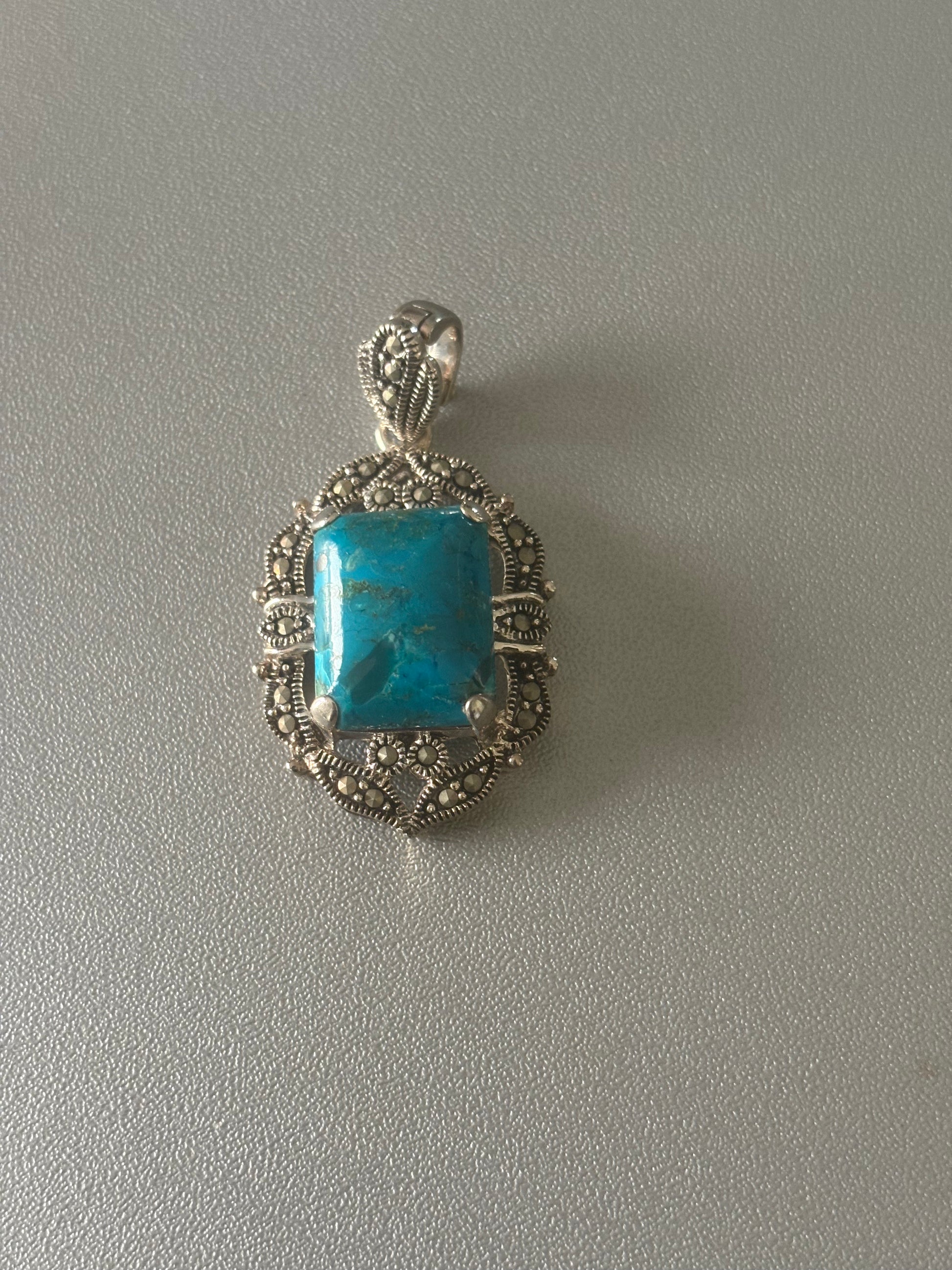 Adorned with sparkling marcasites, this pendant takes inspiration from the iconic Art Deco era, characterized by its bold geometric designs and luxurious embellishments. The shining marcasites, expertly set alongside the turquoise, add a touch of glittering brilliance, creating a mesmerizing contrast that draws the eye and complements the richness of the turquoise. Each facet of the marcasite reflects light in a dazzling dance, enhancing the pendant's overall allure.