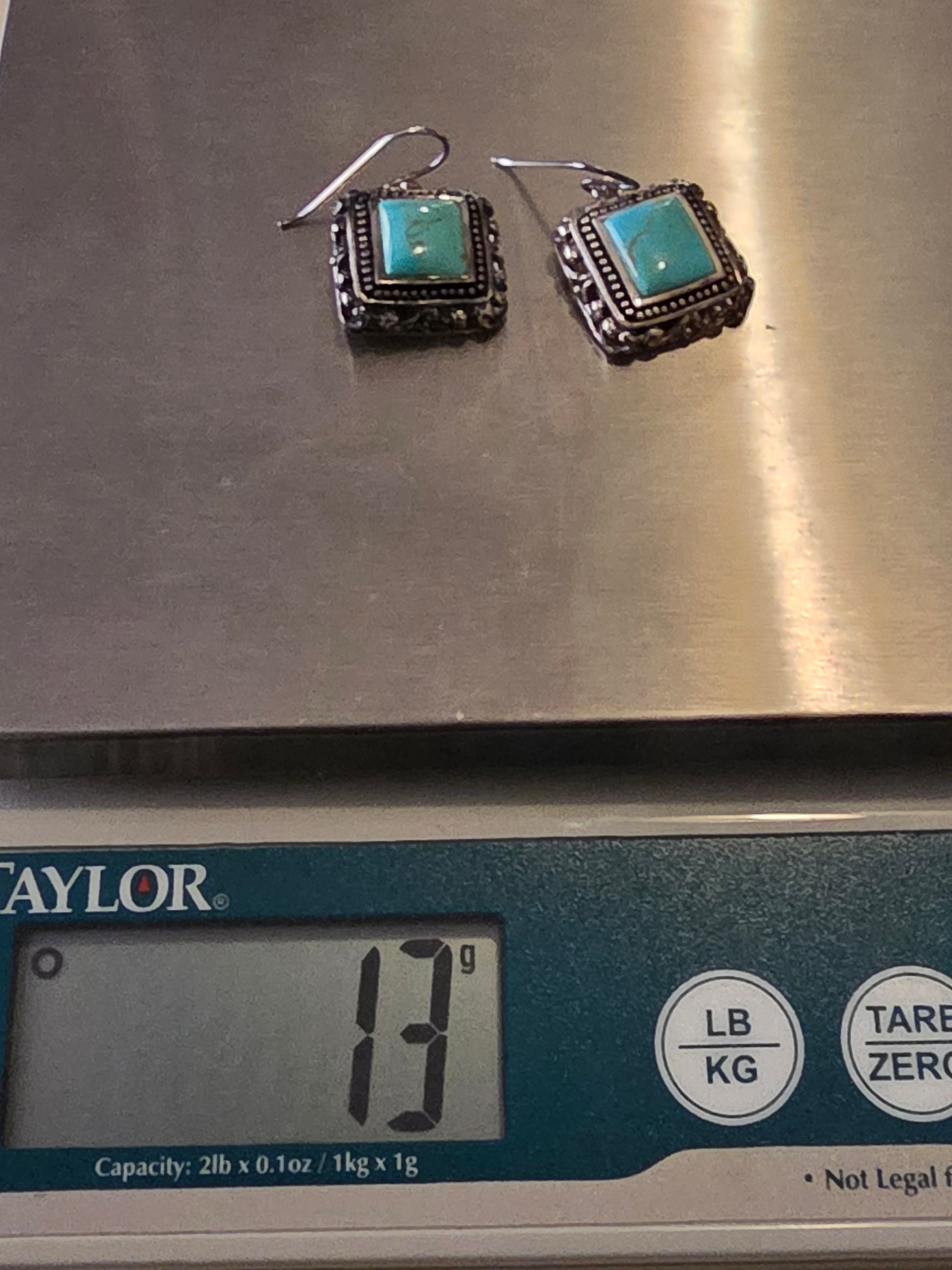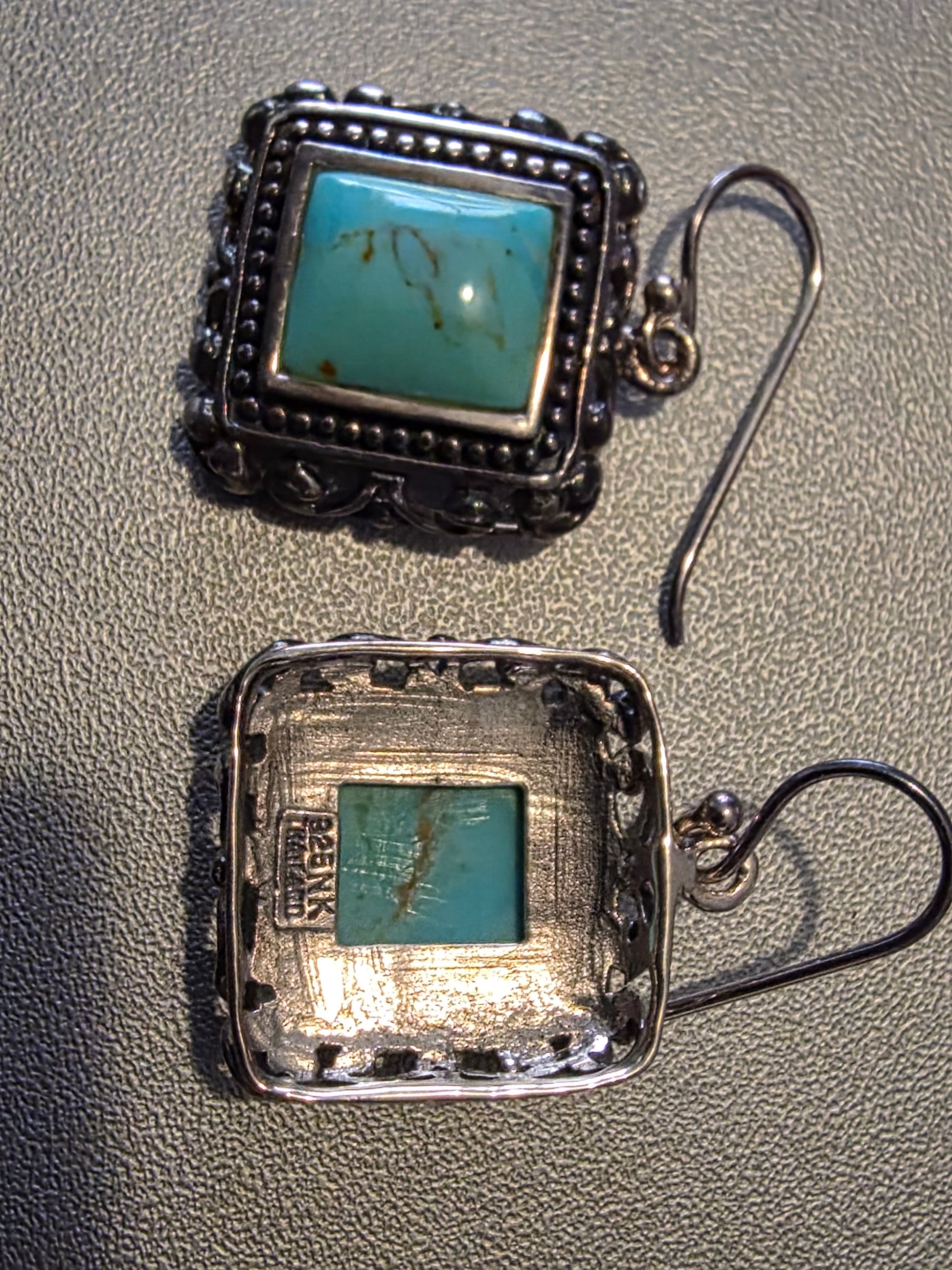 Vintage Turquoise Square 925 Sterling Silver Dangle Earrings with Rope Style Borders